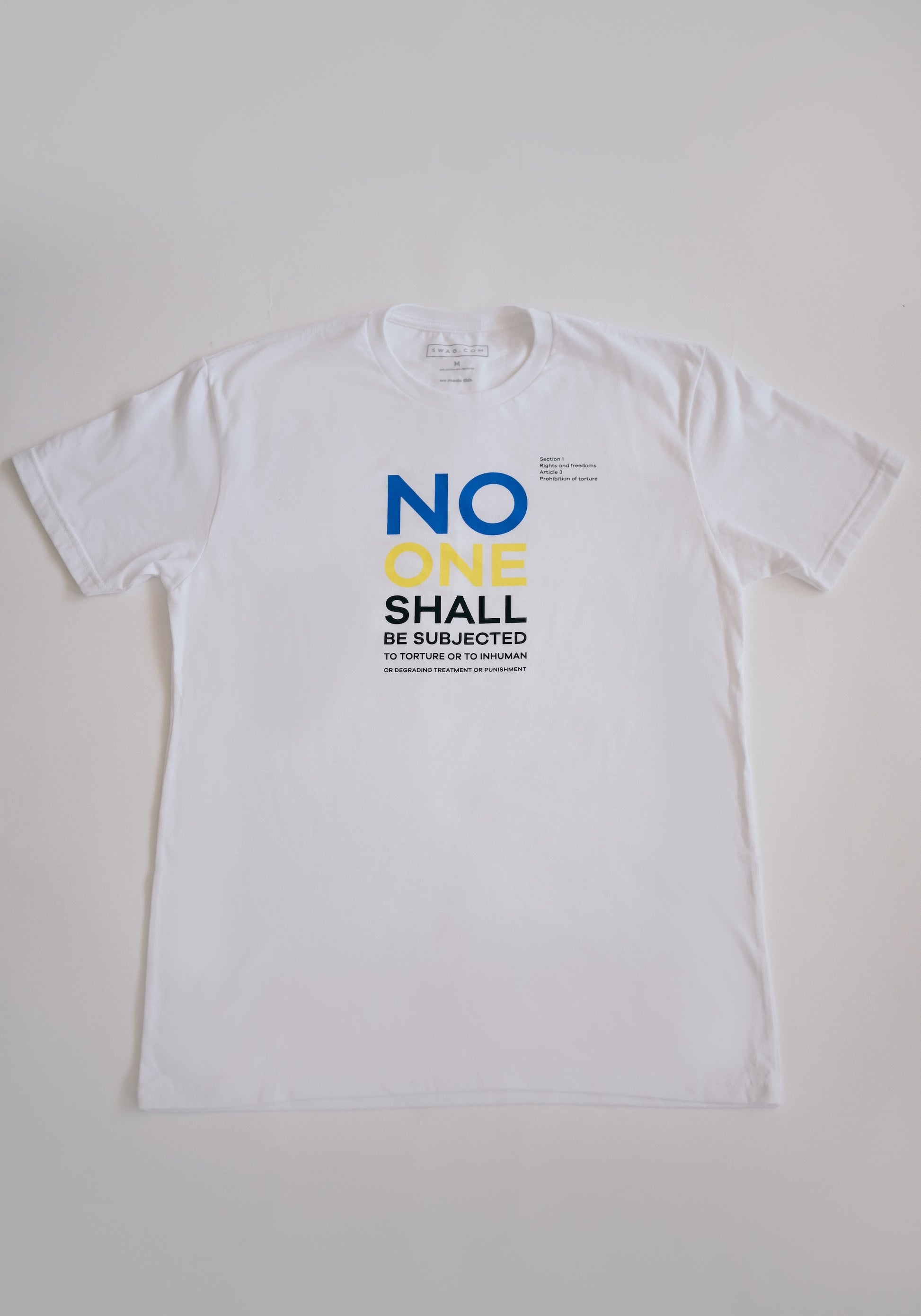 A lightweight poly-cotton crew with a clean, stacked typographic print in blue and yellow. The front reads “No one shall be subjected to torture or to inhuman or degrading treatment or punishment.”—a universal human-rights statement—set on a soft, breathable tee with a classic unisex fit.