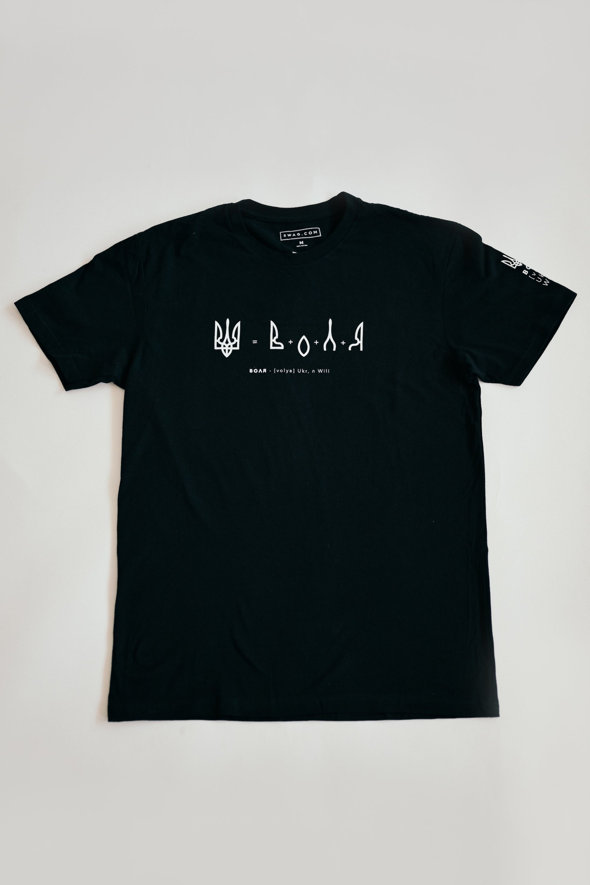 A soft, black unisex crew in premium combed ring-spun cotton. The front graphic deconstructs Ukraine’s trident (Tryzub) into letterforms to create “ВОЛЯ / Volia”—meaning will or freedom. Clean print, classic retail fit, everyday comfort.