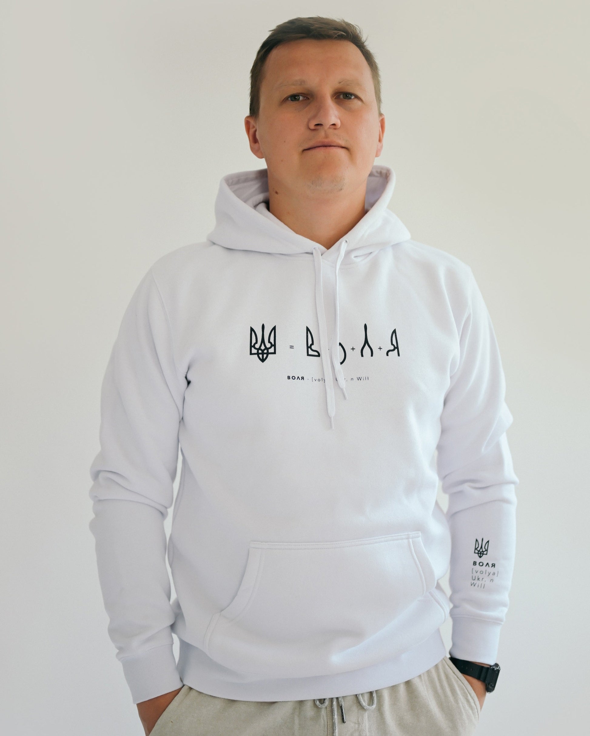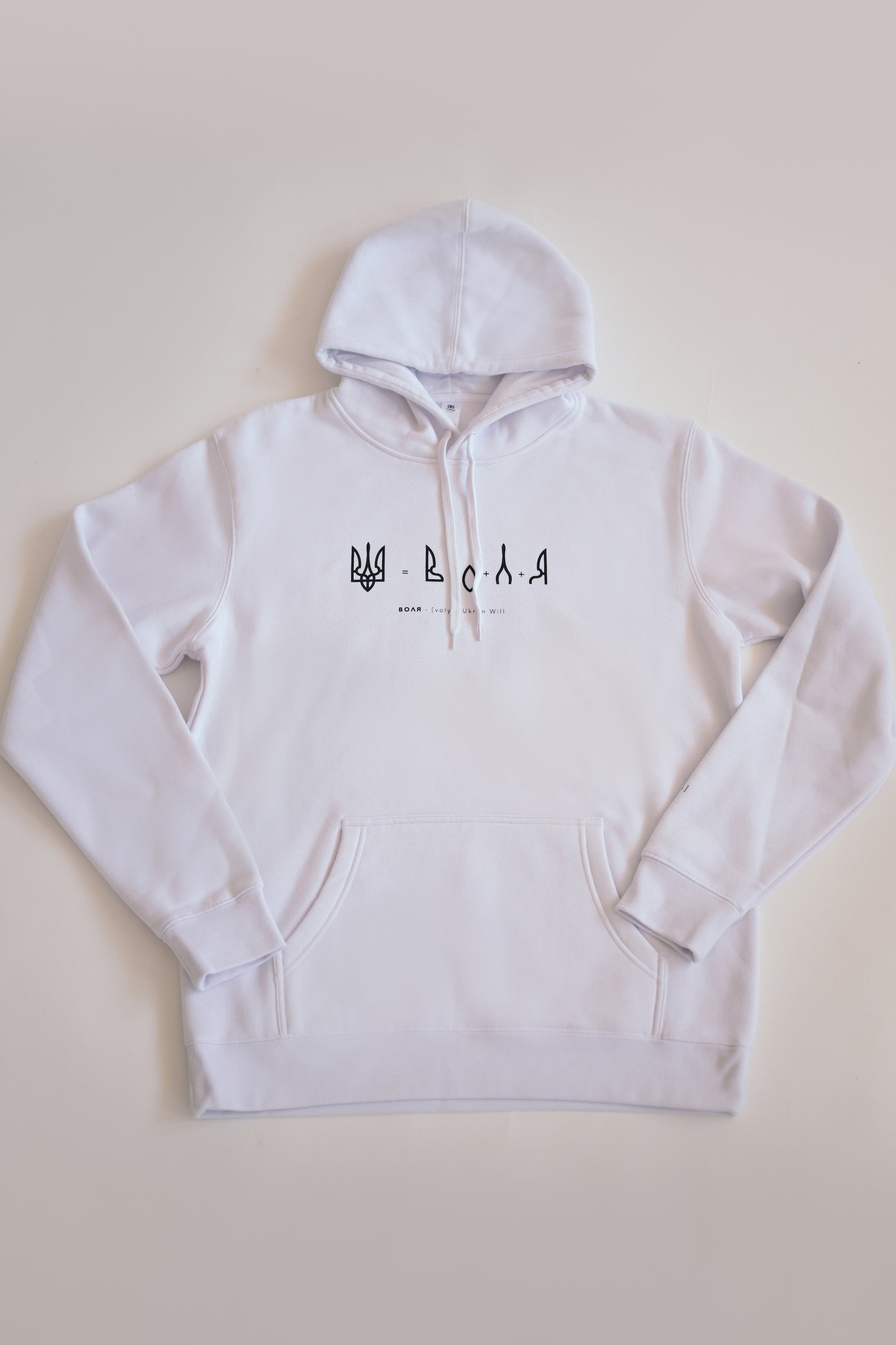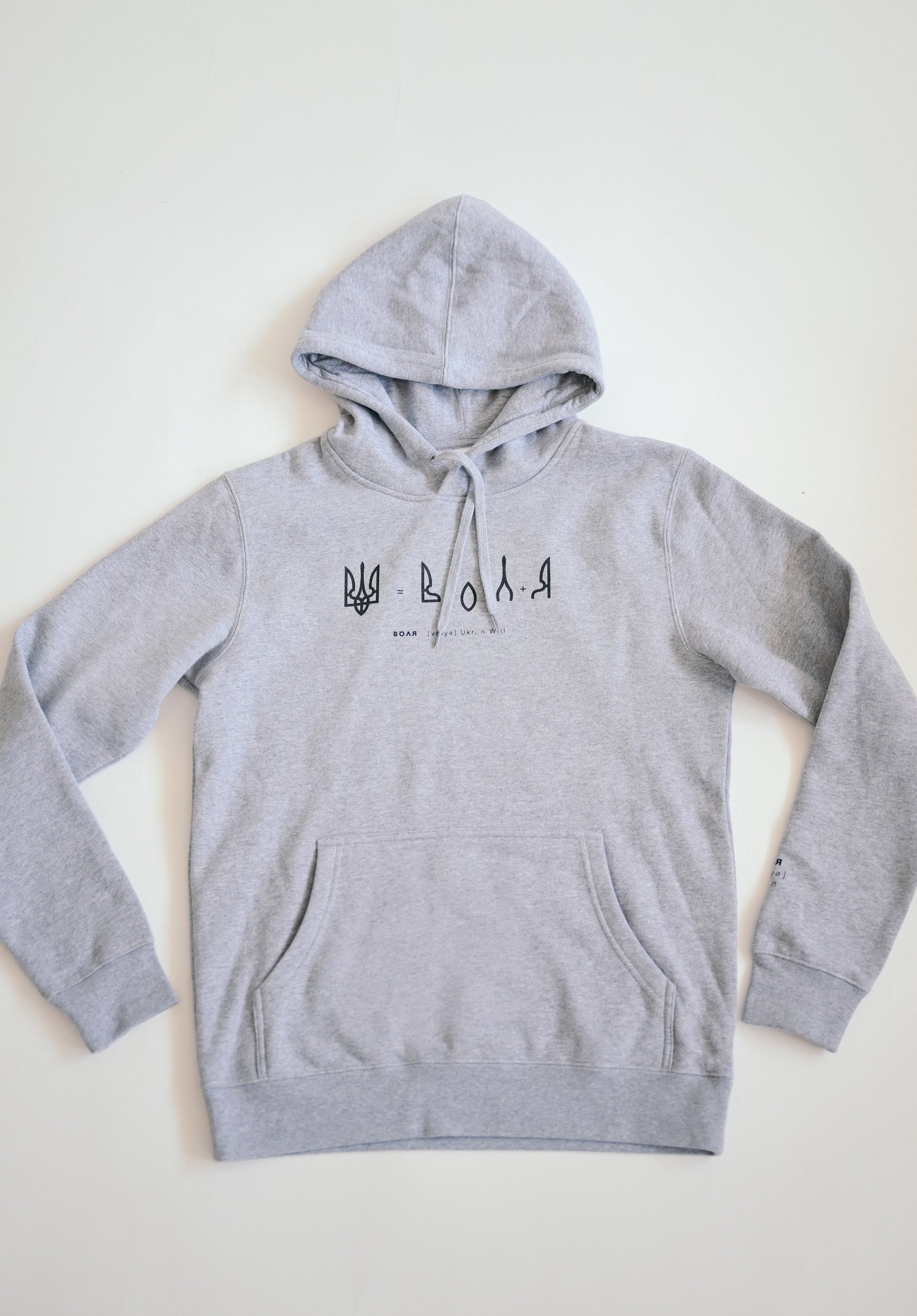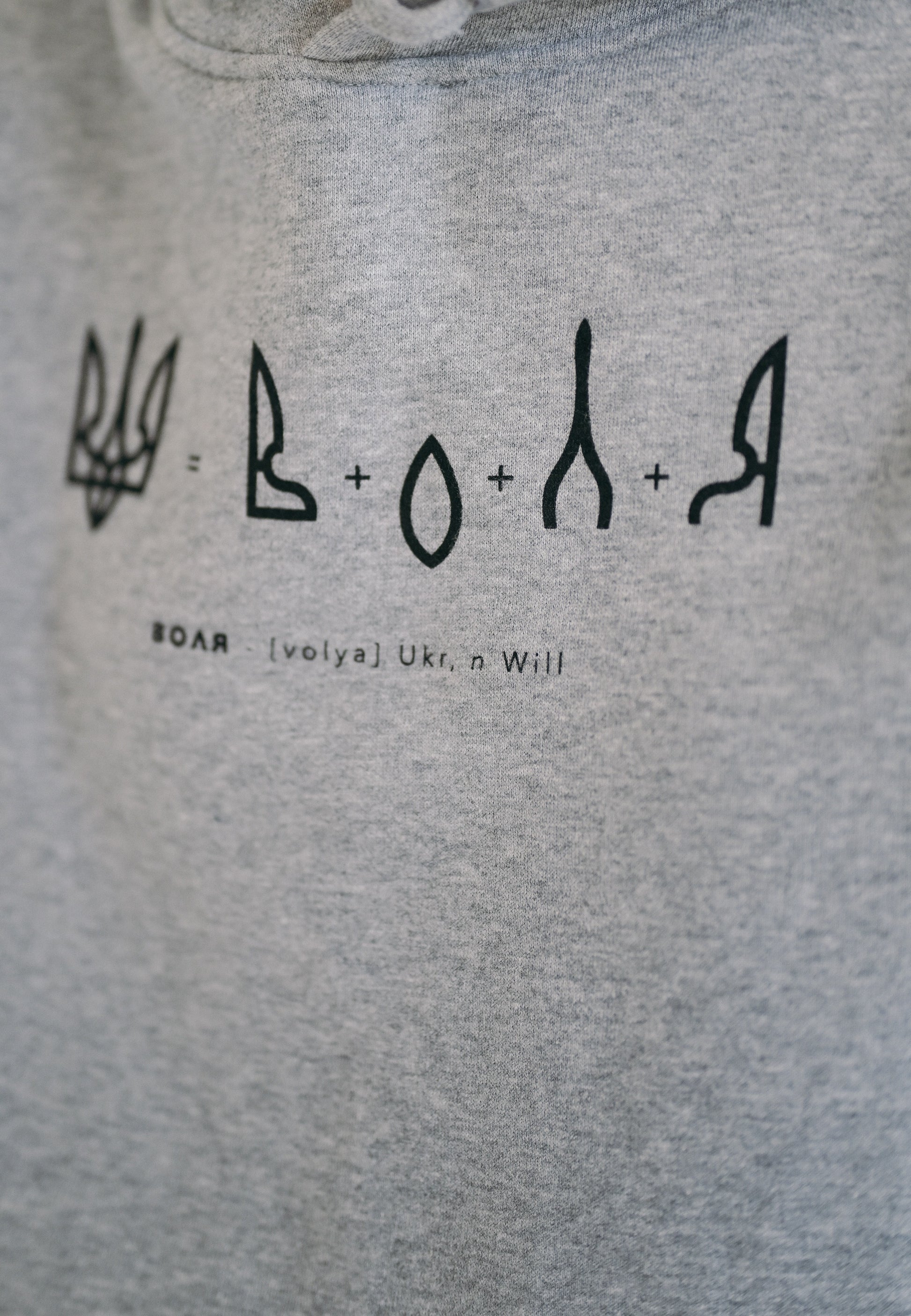 A mid-heavy fleece hoodie with a clean front graphic that deconstructs Ukraine’s trident (Tryzub) into the letters В • О • Л • Я to form “ВОЛЯ / Volia.” Soft brushed interior, regular fit, lined hood, and a roomy kangaroo pocket. Subtle sleeve detail completes the look.